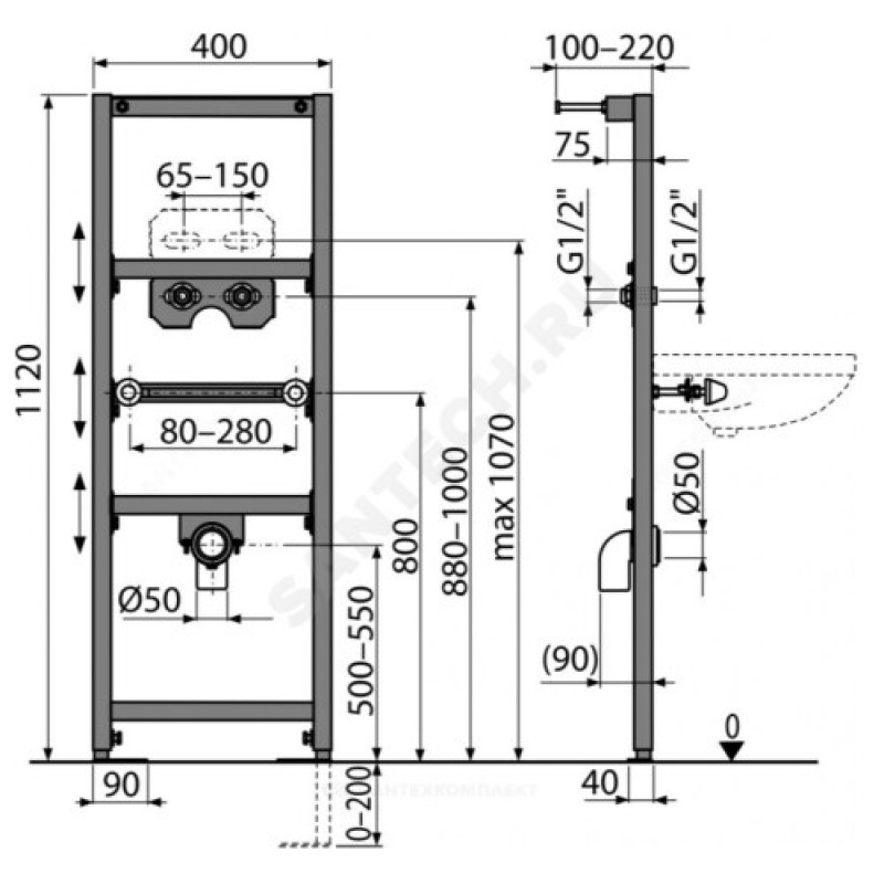| Комплект поставки | РамаМонтажный комплект: винт ?8?60 – 4 шт., дюбель ?12 – 4 шт.Монтажный комплект для крепления раковины: винт М10?100 – 2 шт.Колпаки для закрытия гаекРезьбовое соединение для подключения воды: G1/2"–G1/2"Стоковое колено HT50 с прокладкой |