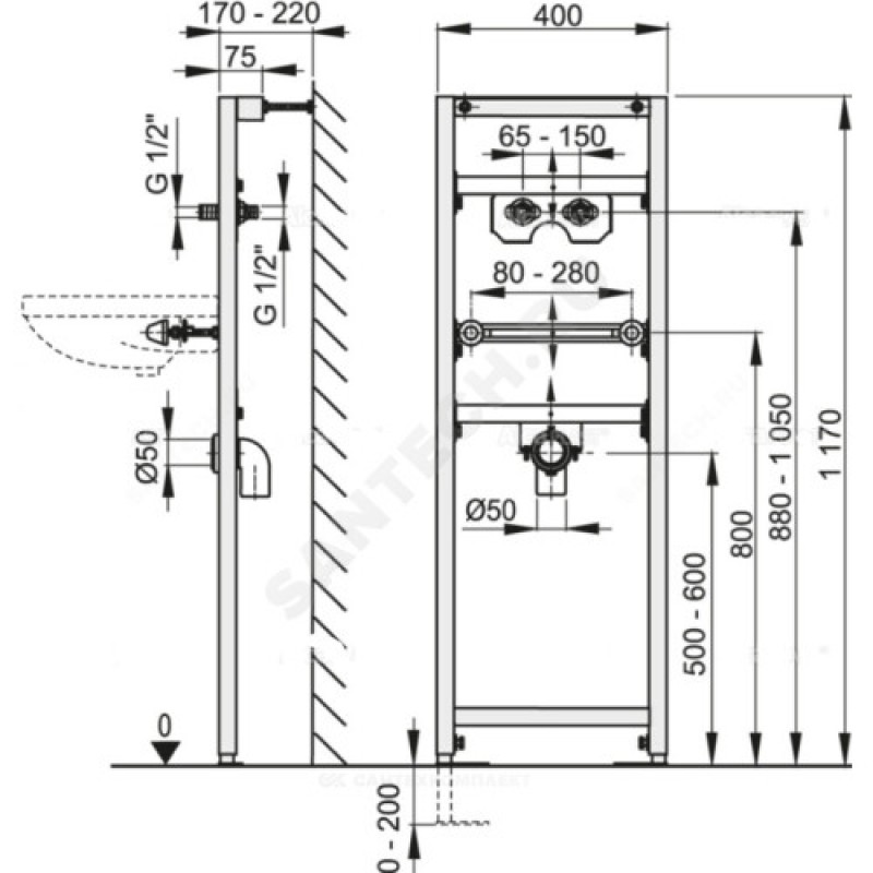 | Комплект поставки | РамаМонтажный комплект: винт ?8?60 – 4 шт., дюбель ?12 – 4 шт.Монтажный комплект для крепления раковины: винт М10?100 – 2 шт.Колпаки для закрытия гаекРезьбовое соединение для подключения воды: G1/2"–G1/2"Стоковое колено HT50 с прокладкой |