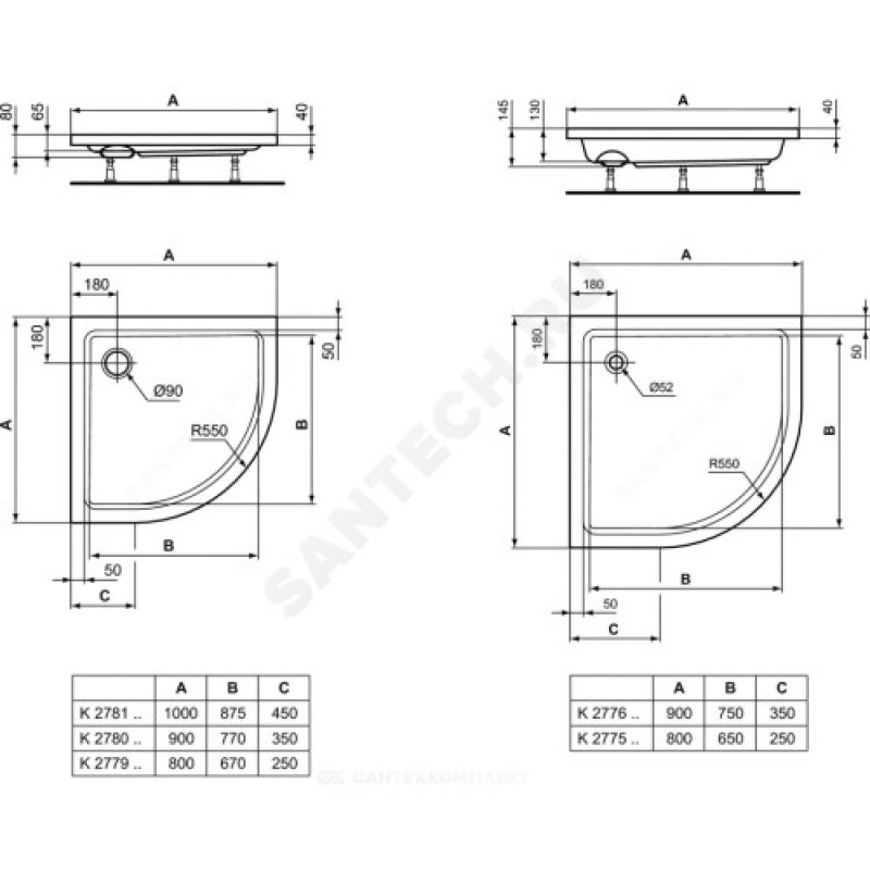 | Наименование производителя | Поддон душевой акрил полукруг HOTLINE 800х800х70 Ideal Standard K277901 |