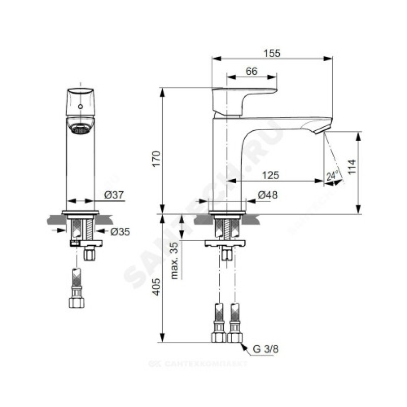 CONNECT AIR Grande Смеситель для раковины, тонкий корпус 36 ммсистема монтажа EASY-FIX (облегченный монтаж)аэратор Perlator M24x1 с ограничением потока 5 л/мин.керамический картридж 25 мм без функции HWTC, без функции CLICKгибкая подводка PEX G3/8" 400 ммбез донного клапана