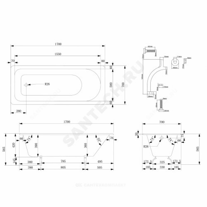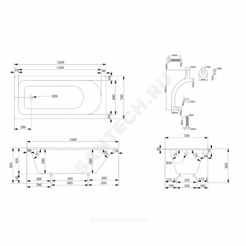 - Артикул:Ванна чугунная 150х70 в/к ножки 1 шт Selena .