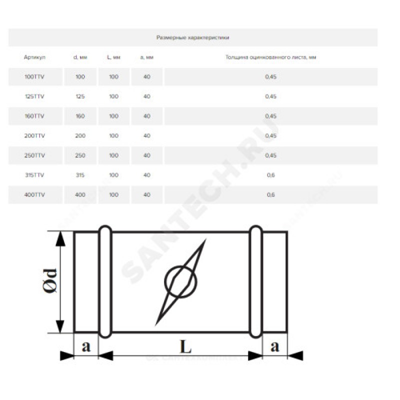 | Наименование производителя | Дроссель-клапан, серия TTV, для круглых воздуховодов, D100, оцинкованная сталь |