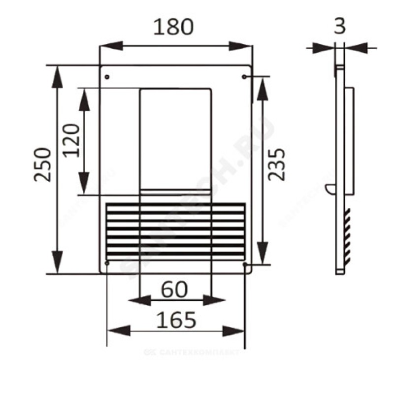 | Диаметр или поперечное сечение воздуховода (вентилятора) | 60х120 |