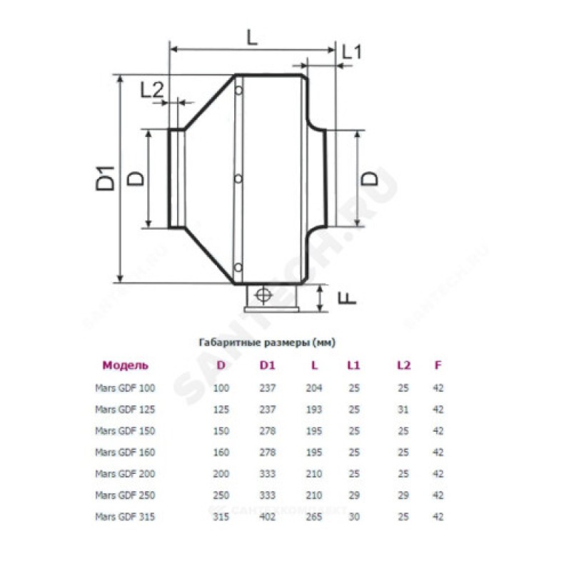 | Наименование производителя | Вентилятор канальный центробежный MARS GDF D100, 62 ВТ, 245 куб.м |